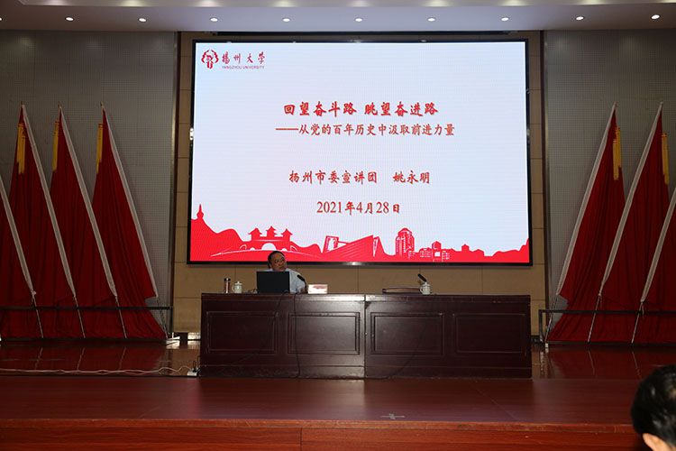 4月28日,党史学习教育扬州市市委宣讲团宣讲报告会在我院召开。扬州市委宣讲团成员、扬州大学研究员,人武部部长、保卫处处长姚永明教授作了题为《回望奋斗路,眺望奋进路一一从党的百年历史中汲取前进力量》的报告,为学院党员干部送来了催人奋进的精神食粮。