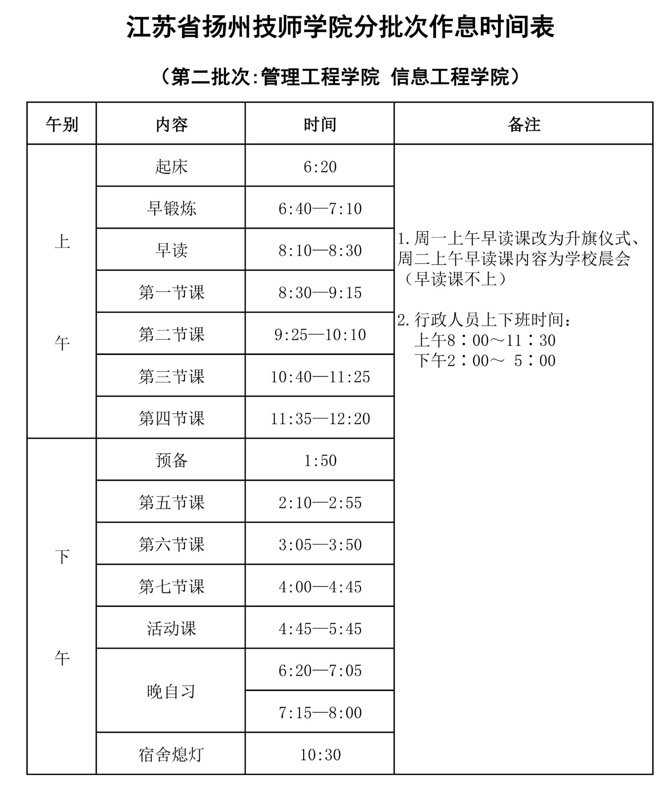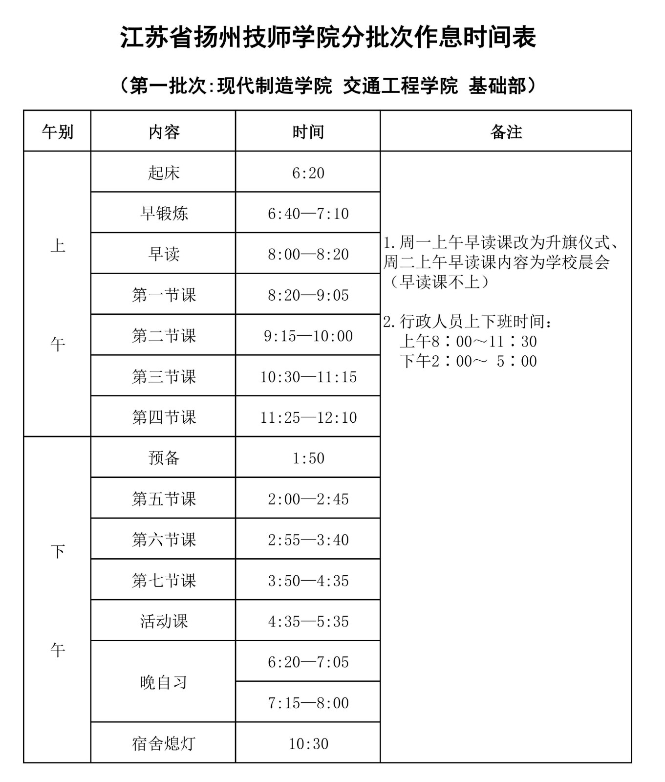 江苏省扬州技师学院作息时间表 发布时间:2026-01-26 浏览次数:12072次 【字体:小 大】 (新)江苏省扬州技师学院分批次作息时间表(2026年3月起执行).pdf 附件下载:暂无下载地址 【打印正文】 相关文章 01-26江苏省扬州技师学院作息时间表