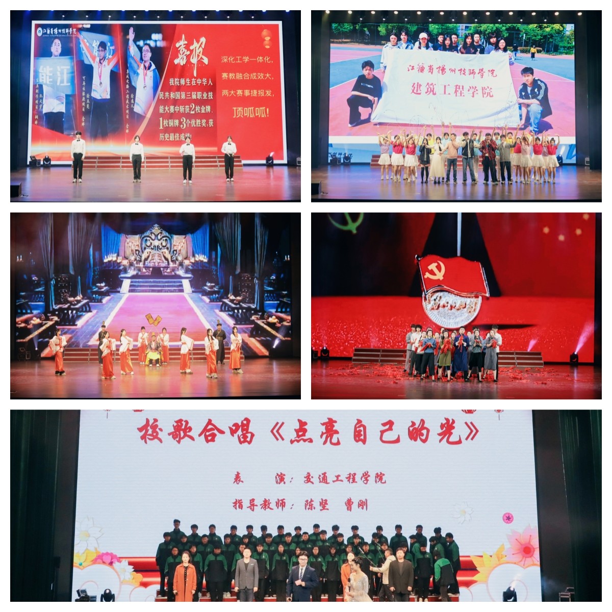 交通工程学院师生合唱的校歌《点亮自己的光》凝聚着技工精神的旋律,是我们每一位技师学子的青春宣言,激励我们以精进的技能为火种,以德技双优为方向,在歌声中汇聚星河,奋勇前行!现代制造学院同学带来的《三句半》表演,展现了学院的历史传承和办学特色,让我们在欢声笑语中感受到了技师学子团结拼搏的精神。建筑工程学院师生的歌舞串烧《永远的少年》和街舞社同学的表演《The best》将演出现场推向高潮,他们用活力的舞步与青春的歌声,诉说着技师学子的成长之路。基础部职教高考班的同学用流利的英语演绎了情景剧《荆轲刺秦》,展示了他们扎实的英语功底与勤学奋进的精神。管理工程学院同学的舞蹈《红船》和信息工程学院同学的话剧《金陵十三钗》,展现了我们技师学子对党、对祖国的热爱、感恩和祝福。智能控制学院同学的朗诵《诗词里的扬州》,让大家在传统文化的熏陶中厚植了家国情怀、坚定了文化自信。编曲社的同学以青春为笔、以热爱为谱,用匠心独立完成歌曲《青春的誓言》的创作,他们用清澈的吟唱、真挚的旋律,让我们一起在成长的路途上,不忘初心、乘风破浪、扬帆远航。