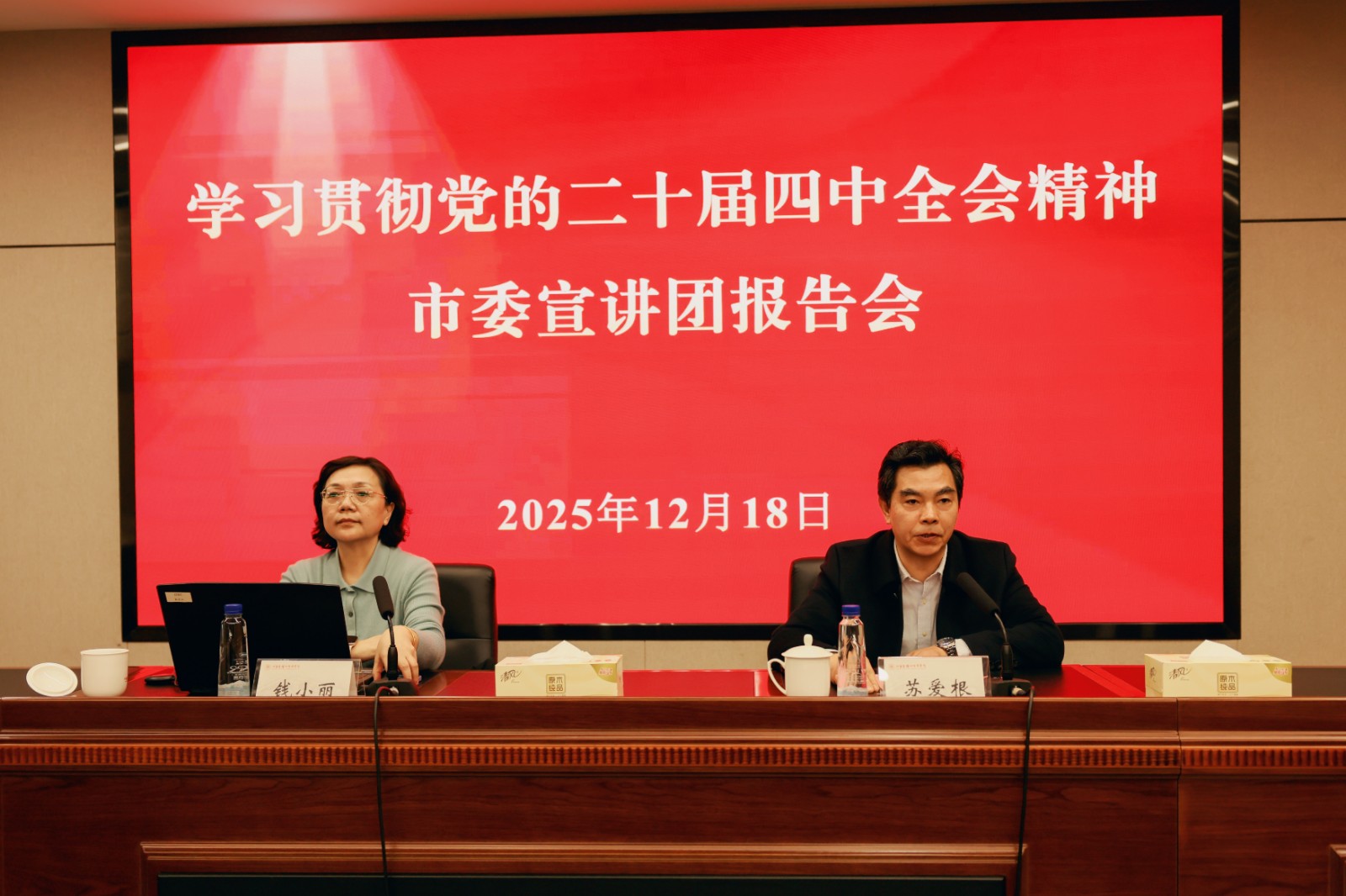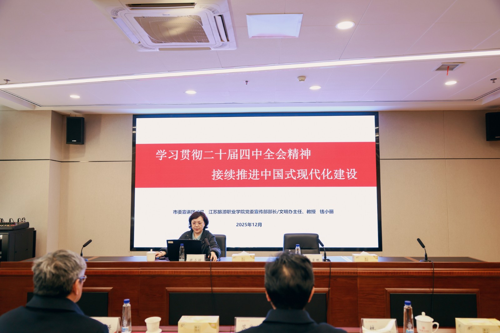 12月18日下午,学院在2号楼303会议室举行学习贯彻党的二十届四中全会精神市委宣讲团报告会。扬州市委宣讲团成员、江苏旅游职业学院党委宣传部部长、文明办主任钱小丽来校作宣讲报告。党委书记苏爱根主持会议并讲话,全体在扬院领导、党员教师代表参加报告会。