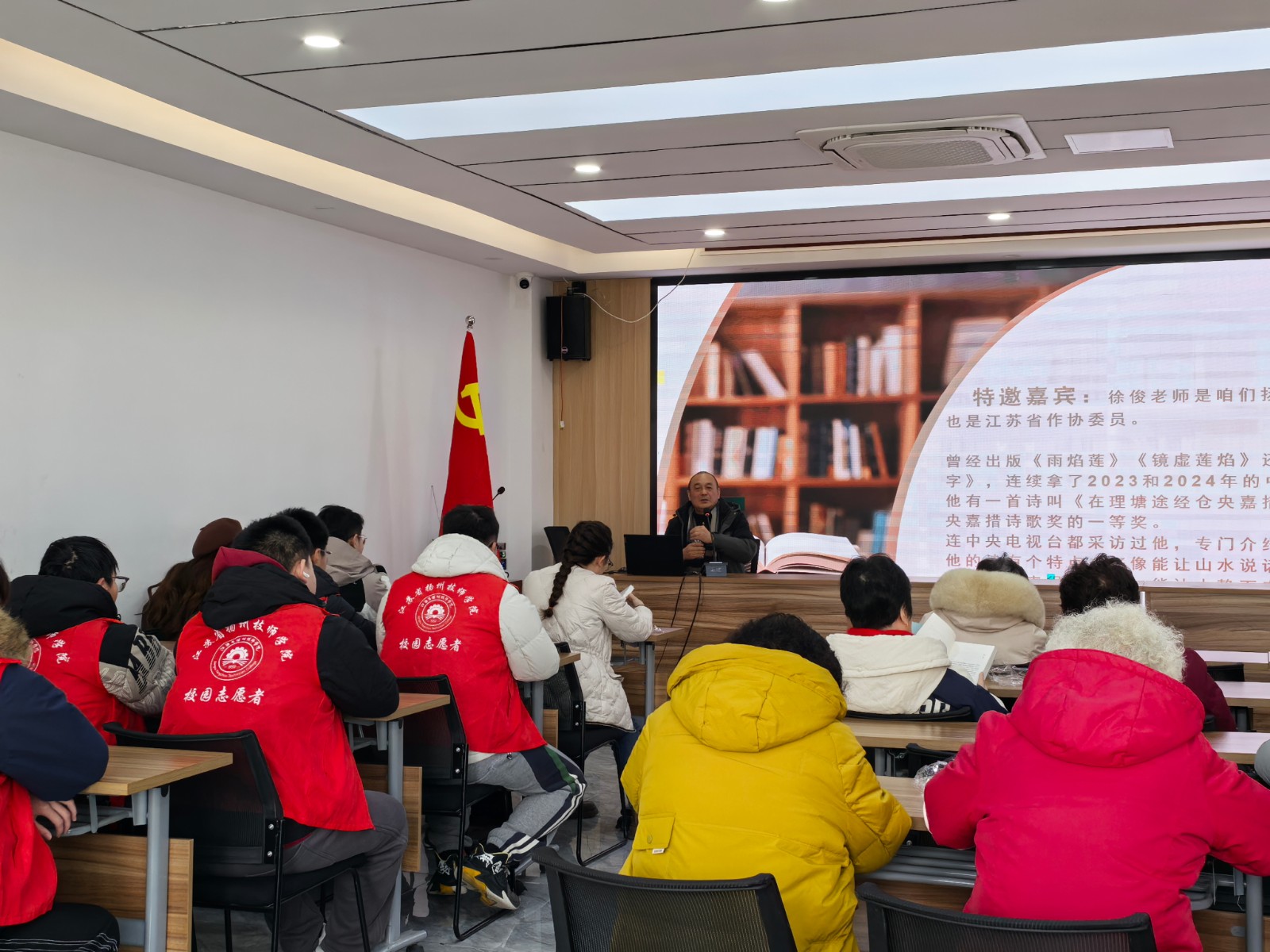 活动现场,江苏省作家协会会员、两度荣获中国年度诗歌奖“年度优秀诗人奖”的扬州籍诗人徐俊老师作为特邀嘉宾,与在场师生和居民分享了他的创作心得与阅读感悟。他从个人作品《教群山识字》谈起,生动阐述了文学如何记录时代、关照生活、滋养心灵,并结合自身支教经历,讲述了创作背后的难忘故事与经历体悟,激发了大家对文学世界的向往和对人生价值的思考。